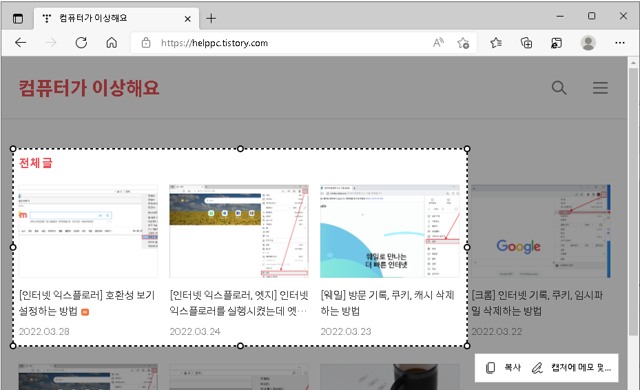 지금까지 [엣지] 자체 기능으로 쉽고 빠르게 캡처하는 방법을 알아봤습니다.